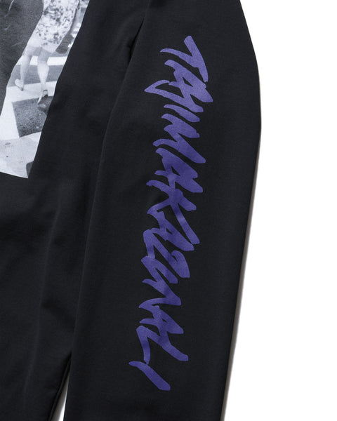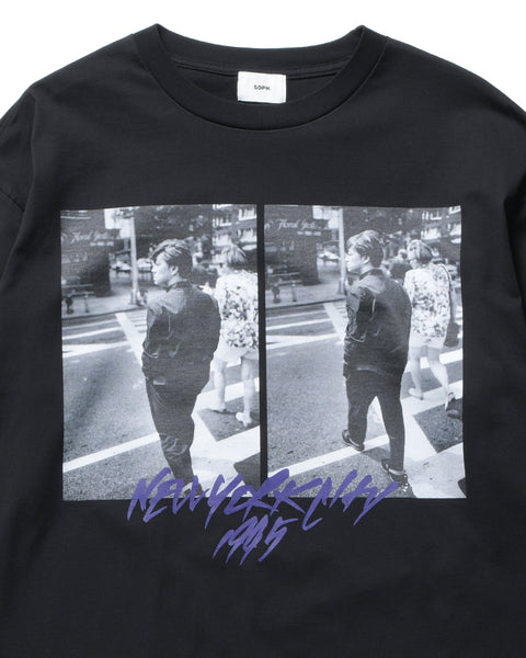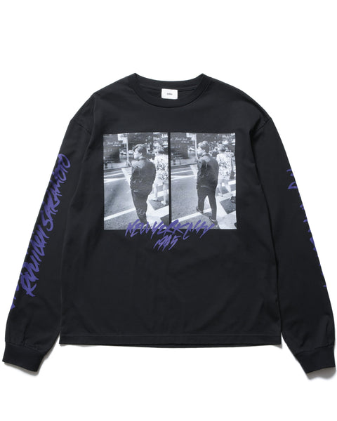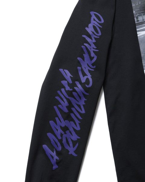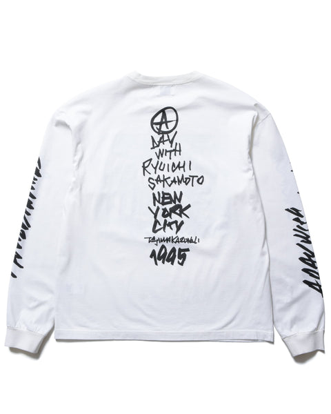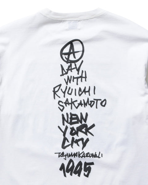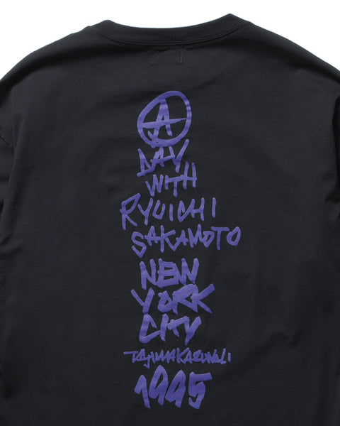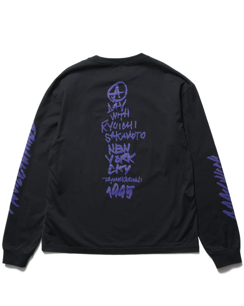DAY WITH RYUICHI SAKAMOTO" is a compilation of a single day spent with Sakamoto and Tajima, photographed alone in Manhattan on the streets, subways, cafes, restaurants, and more. This long-sleeved T-shirt features a variety of typography and images of everyday scenes from New York. The relaxed fit complements the natural mood expressed in the photographs.