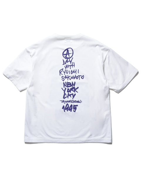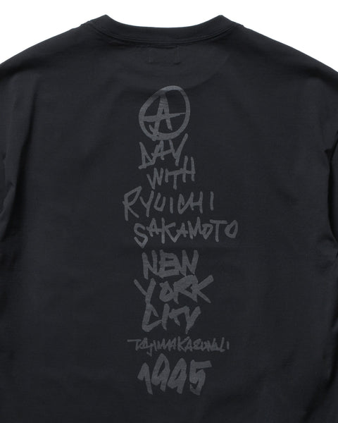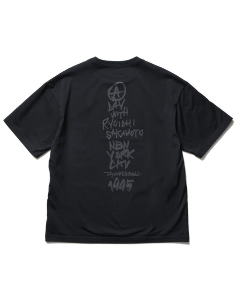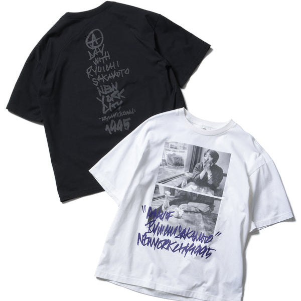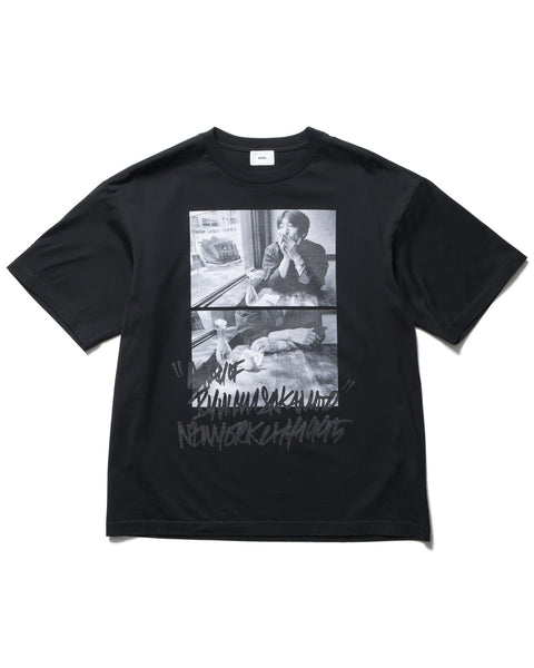 A DAY WITH RYUICHI SAKAMOTO" captures a day in Manhattan, photographed alone by Sakamoto and Tajima on the streets, in the subway, at cafes, and in restaurants. This short-sleeved T-shirt features a relaxed scene at a tea salon. The relaxed, boxy silhouette makes it a piece you'll want to wear without any hesitation, just like the everyday atmosphere depicted in the photographs.