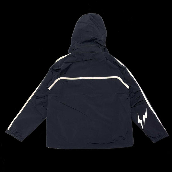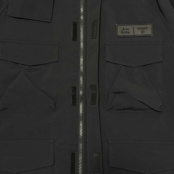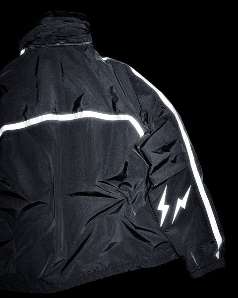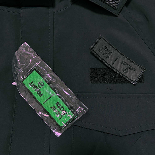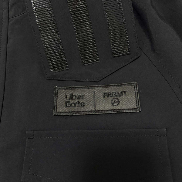 This jacket, designed exclusively for Uber Eats by Hiroshi Fujiwara, features the iconic Thunderbolt reflective print on the right sleeve and the Uber Eats and fragment logo on the left chest, creating a special design for delivery partners.