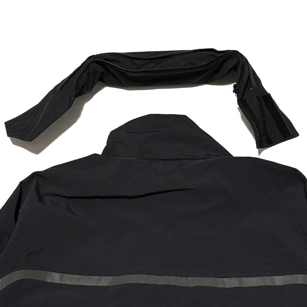 The entire jacket is water-repellent, and the foldable hood stows in the collar, ensuring comfortable and safe delivery even when sudden rain showers occur.