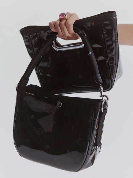 The bag body, featuring a beautiful, delicate jacquard-woven fabric overlaid with glossy PVC material, catches the light and shimmers.