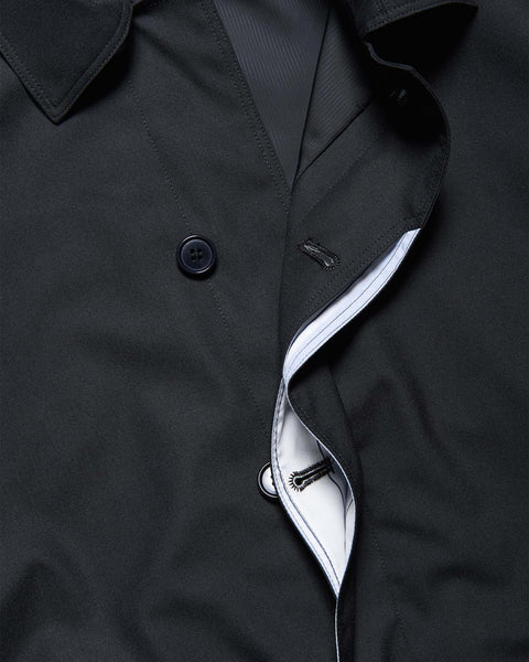 A shirt blazer crafted from stretch wool fabric that offers a relaxed drape while resisting wrinkles. Available in two colorways: solid black and pinstripe. The collar lining features a seasonal striped fabric as a subtle style accent. We recommend layering it with a matching shirt in the same material or wearing it as a set with three types of pants.