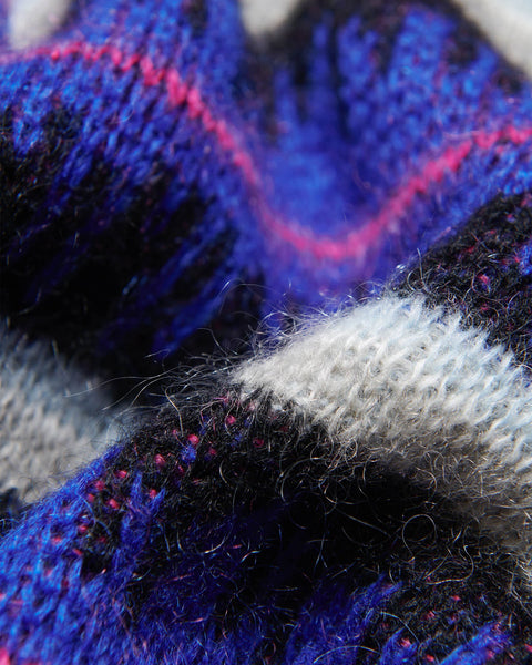 Inspired by vintage mohair knits, this bordered knit blouson features buffalo-style buttons and a colour scheme with distinctive UE accents. Crafted from premium tamtam yarn derived from kid mohair, it combines moderate volume with an elegant sheen. The fabric itself incorporates air, achieving both lightweight comfort and excellent warmth retention.