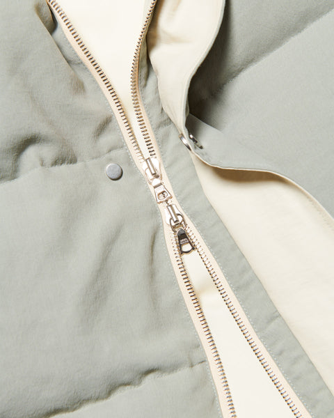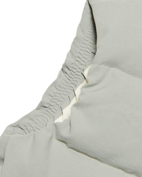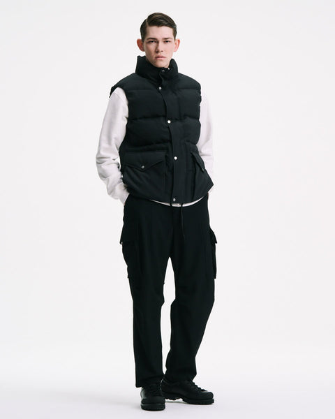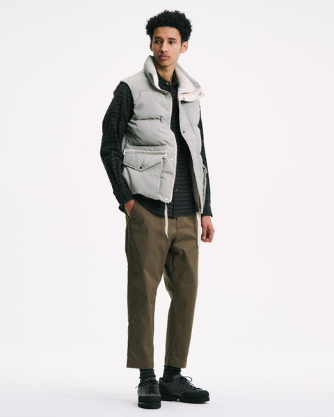 A down vest crafted from hollow-core yarn with a natural-fibre-like texture. This hollow-core yarn is a lightweight, highly breathable material meticulously woven from polyester hollow filaments. The down boasts the same 800 fill power as our jackets. The armholes feature a gathered design to minimise heat loss. This piece showcases meticulous design details, including flat snap buttons and pocket tapes used on the outer surface. Its look avoids excessive sportiness, making it a versatile product that broadens your styling options.