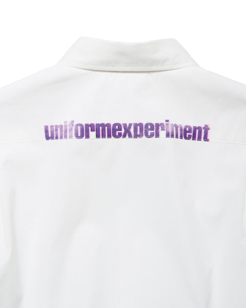 This cotton broadcloth shirt features a natural subtle sheen and a smooth, refined appearance with minimal texture. While seemingly a basic white shirt at first glance, it incorporates the uniform experiment logo printed on the back yoke. This logo showcases a stencil-like fade effect and a gradient reminiscent of blended colours, adding a signature touch of playful creativity characteristic of UE.