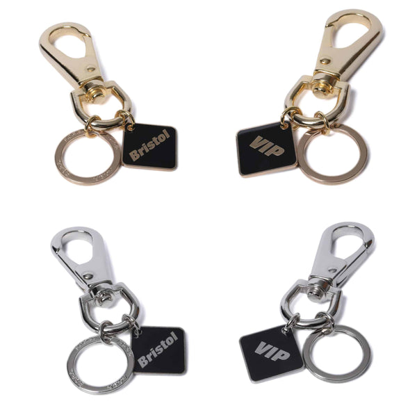 An emblem-shaped keyring featuring VIP graphics. Available in two colors: versatile silver that complements any style, and gold that effectively serves as a coordinating accent. Compatible with all F.C.R.B. pants featuring a D-ring on the belt loop.