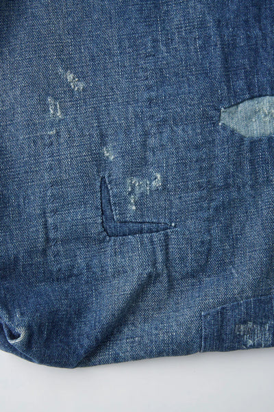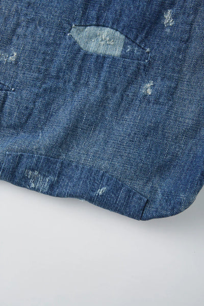 12oz Indigo Denim Woven with the same yarn count in both warp and weft, creating a distinctive mottled texture with shorter, more pronounced irregularities. Features indigo rope dyeing, resulting in a muted, slightly beige-tinged indigo hue. Using 8/- yarn in both directions, it feels lightweight with a slightly smaller 3/1 twill angle and a natural finish.