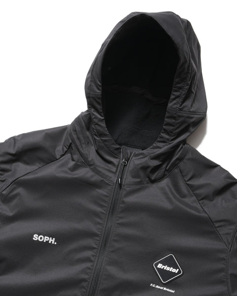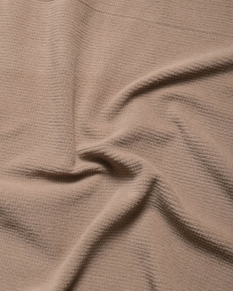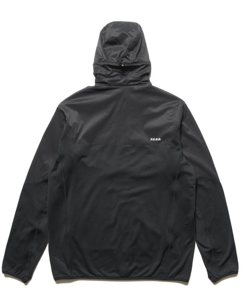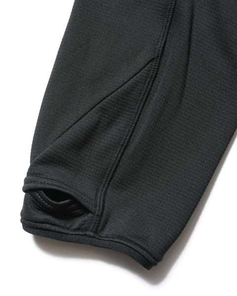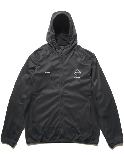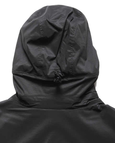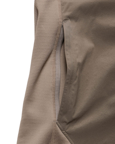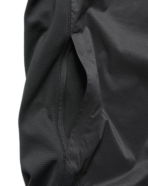 A hybrid hoodie crafted from lightweight yet insulating grid fleece fabric with excellent quick-drying properties, combined with highly stretchable water-repellent ripstop nylon. Offers comfortable wear whether worn alone or as a layer. Available in two colours—black and beige—coordinating with the matching blouson and trousers in the same fabric.