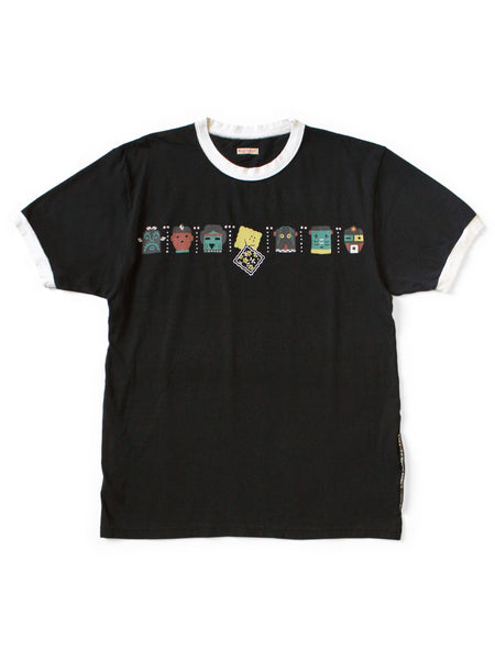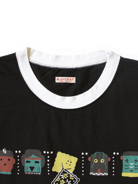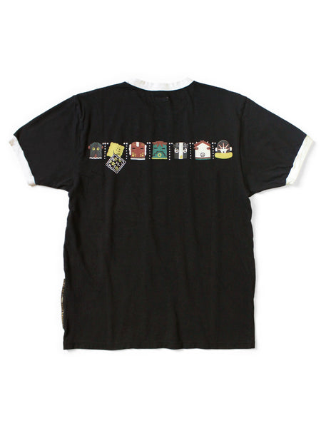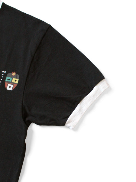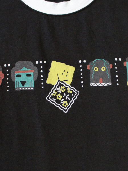 This Ringer T-shirt features a cookie-shaped RAINBOWY print on the front and back, along with images of "Kachinas," spirits worshipped by the Hopi people.