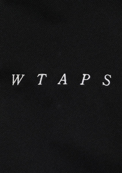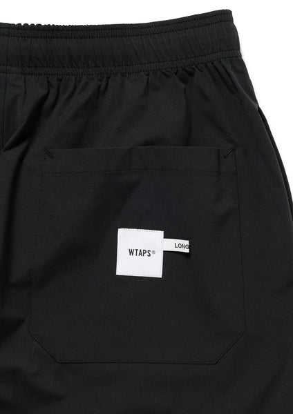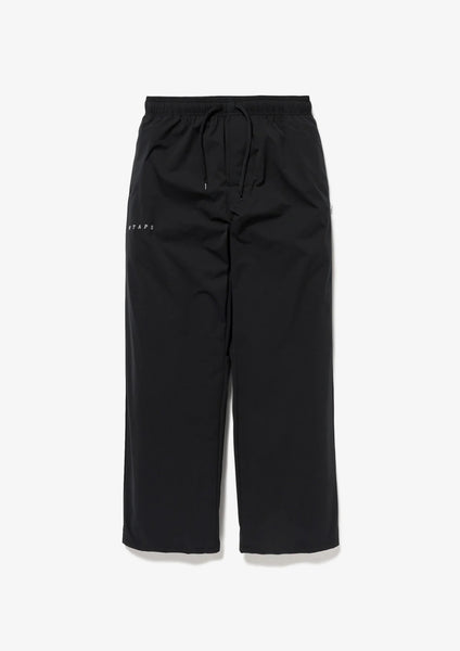 Easy pants made from stretchy polyester twill fabric. Features a slightly wide, straight silhouette. The front features an overlapping closure; while the waist is elasticated, it can also be adjusted using the built-in drawstring. An embroidered motif is featured on the front.