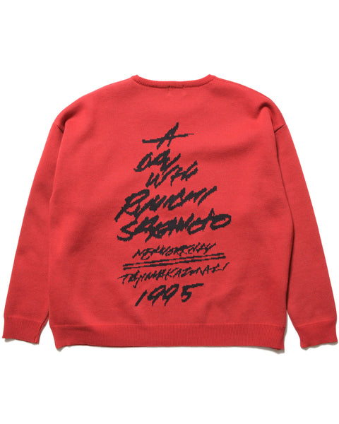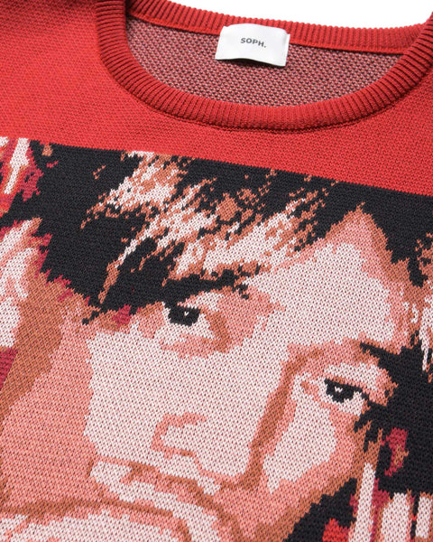 This collaboration combines a selection of photographs of Ryuichi Sakamoto by photographer Kazunari Tajima with artwork by Yoichiro Uchida, a close friend of SOPH. This crew-neck sweater features a portrait from the 1995 issue of "N/Y" on the front and the typography of this project on the back. While available in a limited number of colors, the intricate and delicate jacquard knitting is the work of knitting artist "Knitting☆Horinouchi." This product simultaneously reflects the intellectual and stimulating side of Ryuichi Sakamoto.