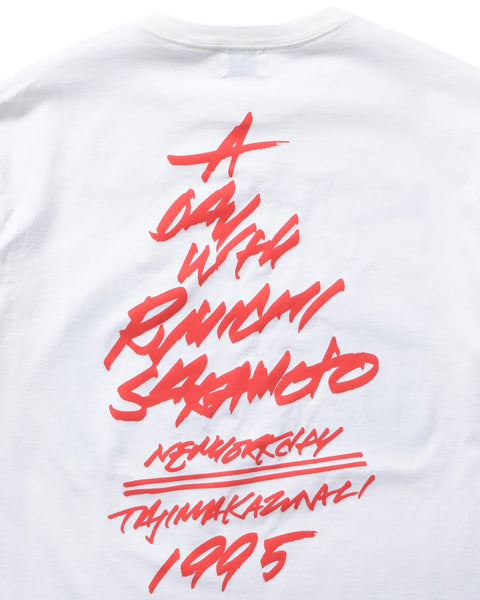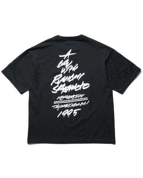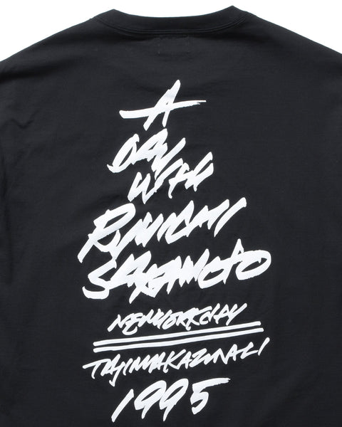 A DAY WITH RYUICHI SAKAMOTO" compiles a day in Manhattan, photographed by Sakamoto and Tajima alone on the streets, in the subway, at cafes, and in restaurants. This short-sleeved top features typography overlaid on photographs of everyday scenes in New York. The relaxed box silhouette makes it suitable for wearing alone or layered.