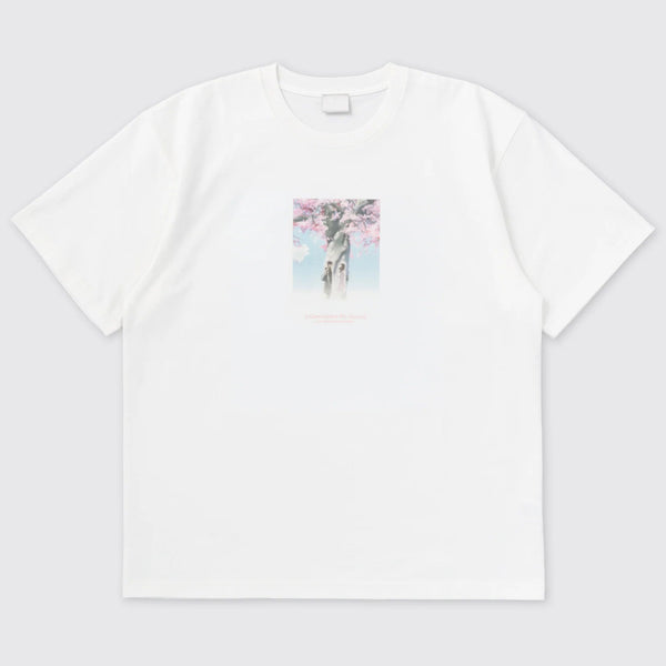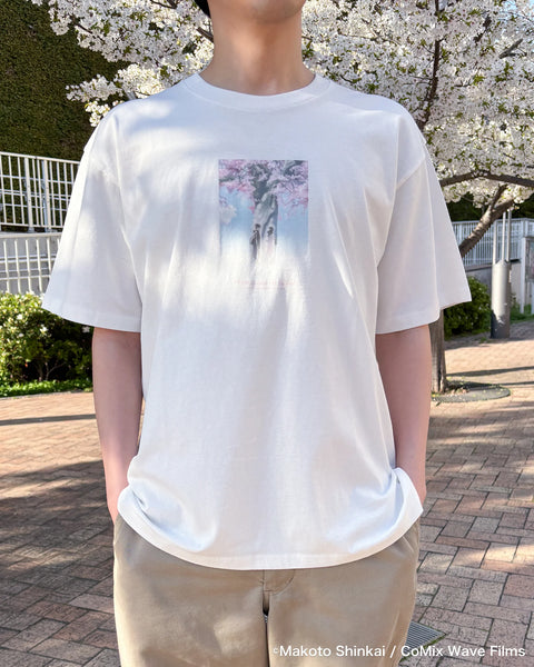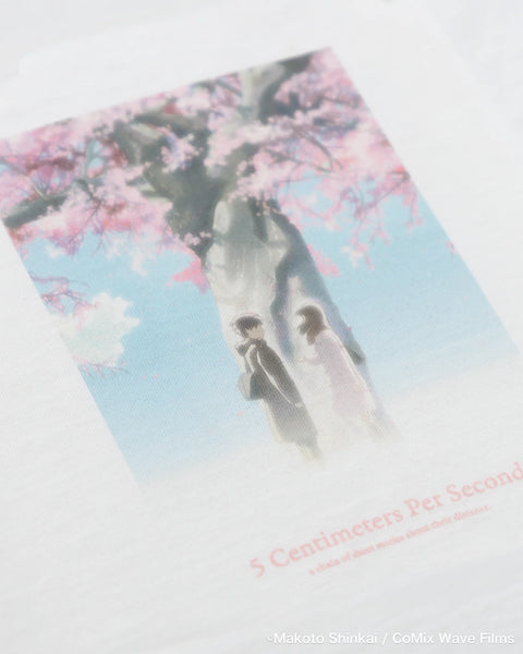 This print design captures a memorable scene from Episode 1, “Tale of Cherry Blossoms,” in which Akari says to Takaki, “It’s just like… snow, isn’t it?” as they stand beneath a cherry tree near Iwafune Station, their memories intertwining. The fabric is a high-quality cotton jersey carefully selected for its perfect balance of thickness, texture, and softness. The inkjet print focuses on color accuracy, creating a piece that allows you to embrace the world of the series.