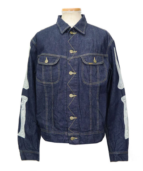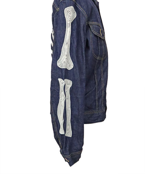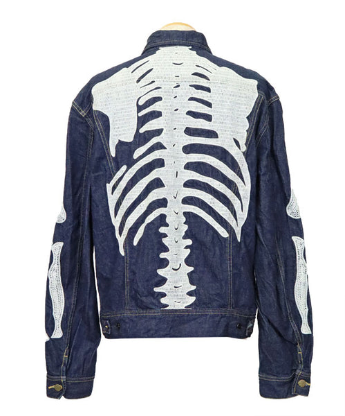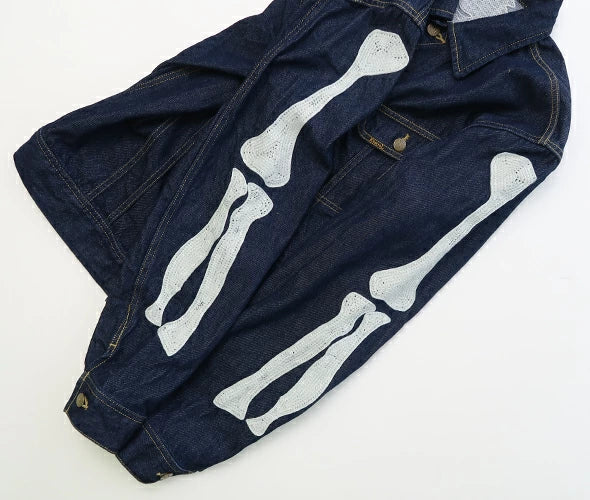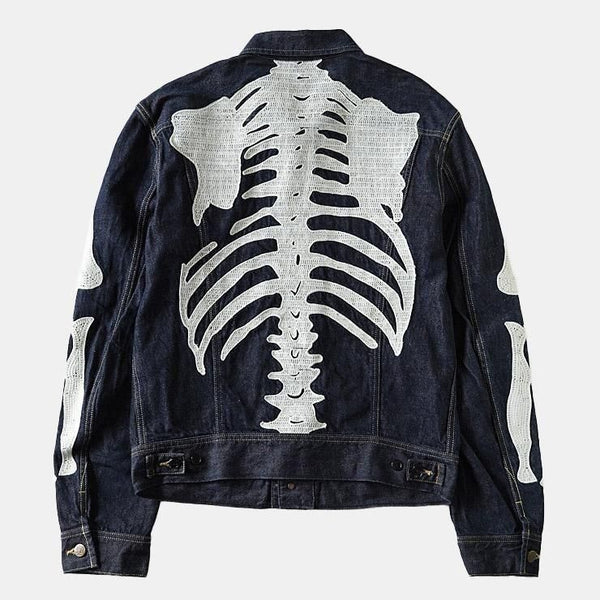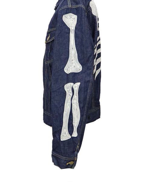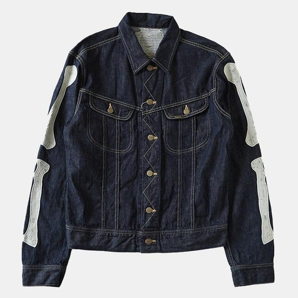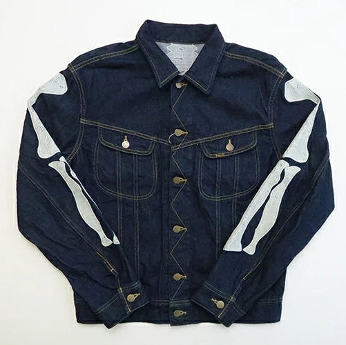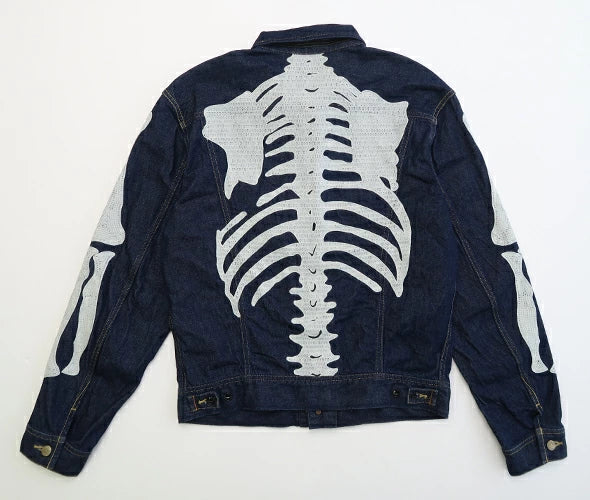 A denim jacket crafted from 11.5oz denim, inspired by Mexico's Day of the Dead. Featuring embroidered, stylised skeleton designs on the back and both sleeves, this piece fully embodies KAPITAL's distinctive aesthetic.