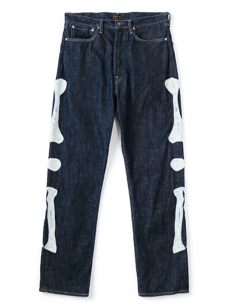 These denim pants feature a gently tapered silhouette and feature embroidered bones on both sides, inspired by Mexico's Day of the Dead.