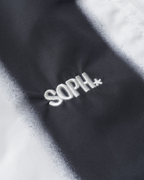 SOPH. TOKYO 26th Anniversary Collaboration with ERIC HAZE: Warm-Up Jacket. The graffiti-font emblem and spray-painted stripes embody the worlds of ERIC HAZE and F.C.R.B. Functional design features water-repellent and windproof polyester taffeta fabric with reflective piping. The quick-dry mesh lining ensures outstanding comfort. It boasts a contemporary boxy silhouette. Set options include two styles: warm-up trousers and game shorts.