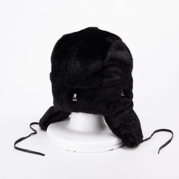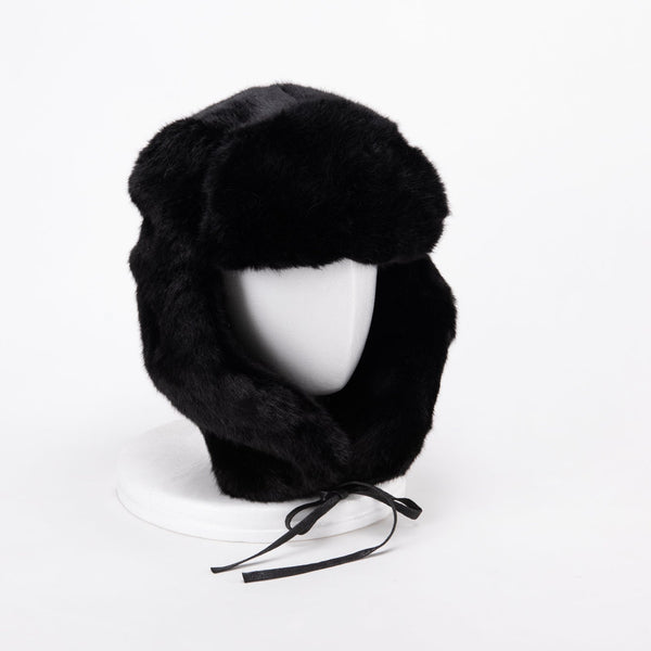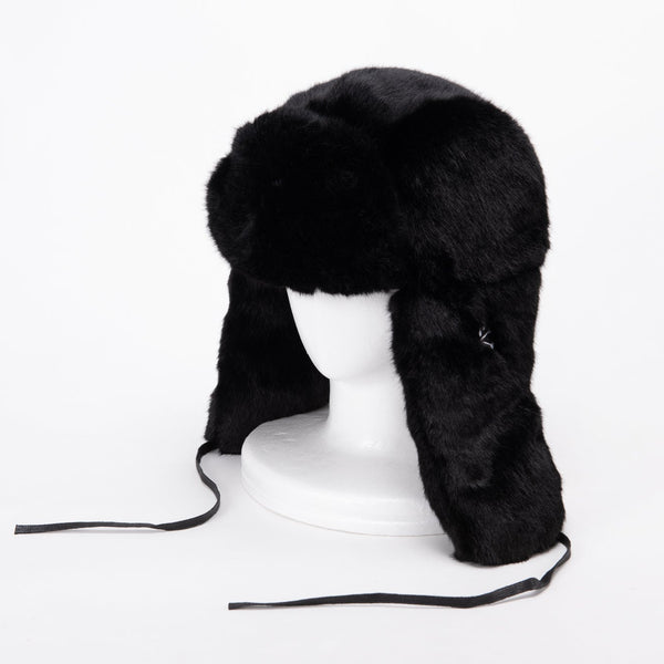 BLACK FAUX FUR TRAPPER is a trapper hat featuring luxurious long-pile faux fur and quilted insulation for superior warmth. Its voluminous silhouette makes a bold statement, while the ear flaps can be worn down or flipped up and secured. A reliable winter companion, it stands up to the harshest cold.