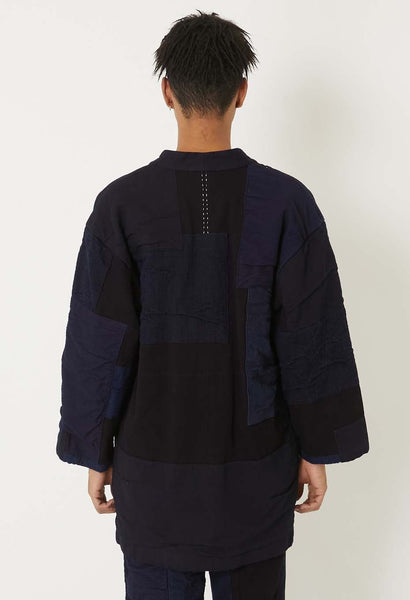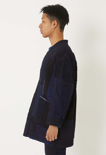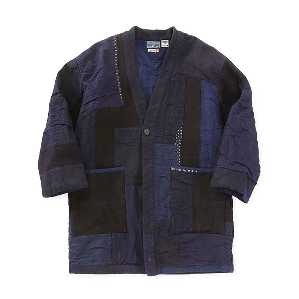 This haori jacket features hand-stitched indigo-dyed sashiko fabric layered with various indigo-colored fabrics.