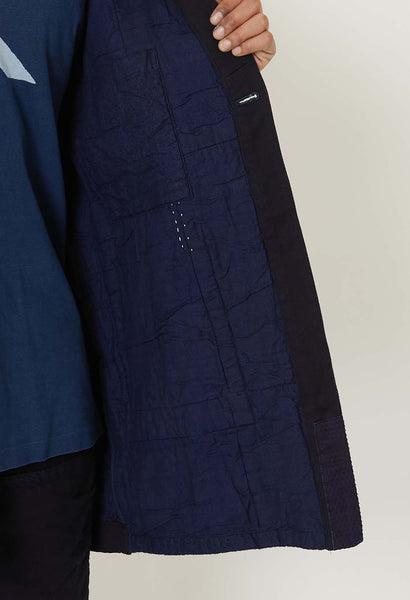 The relaxed silhouette features a slightly curved collar, creating a modern look that differs from the straight lines of kimonos. The large pockets are positioned slightly lower for ease of use. The indigo color will age and adapt to the wearer's lifestyle. The white hand-stitched thread on the back is called "semamori," and has long been associated with protection as a talisman.