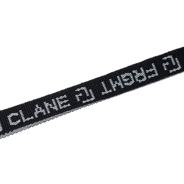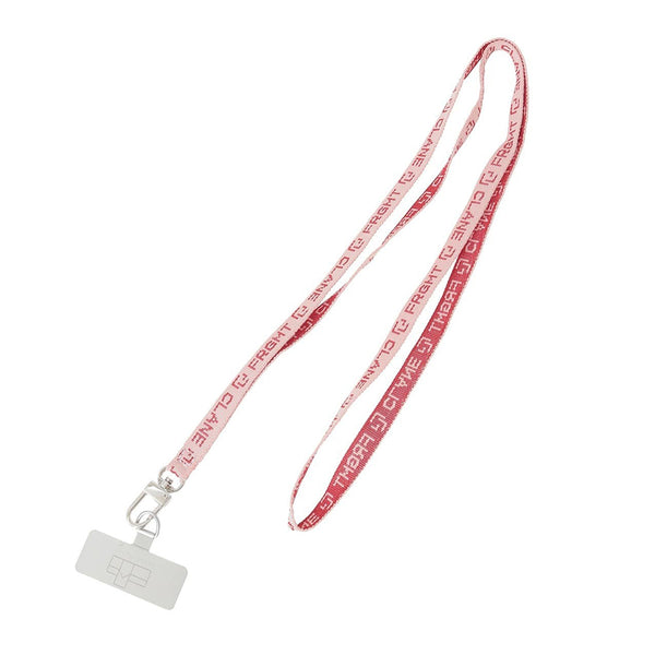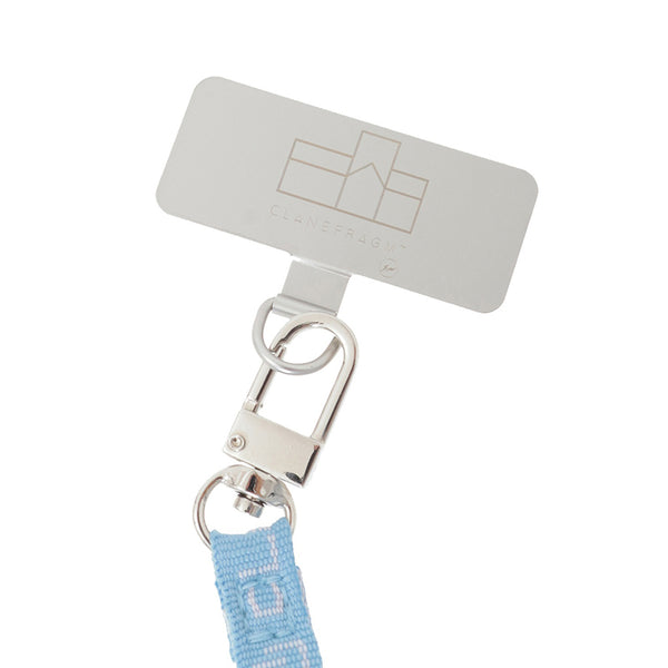This item features a set of a mobile phone strap and a plate to insert into the case. The strap uses tape featuring graphics designed by Hiroshi Fujiwara for this collaboration, rendered in jacquard. The plate is printed with a line art motif designed to evoke a church. The strap is crafted at a length that makes it easy to wear crossbody.