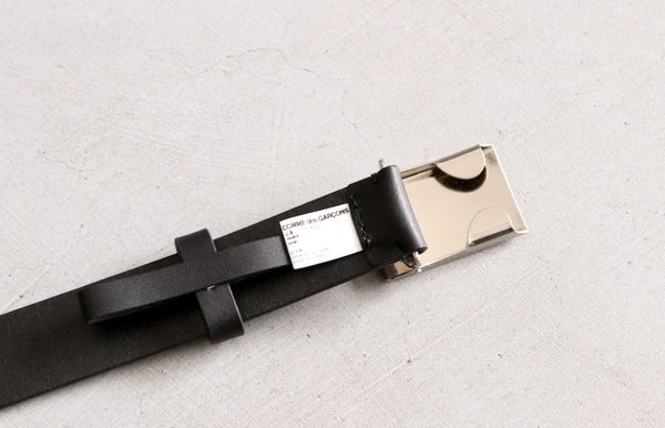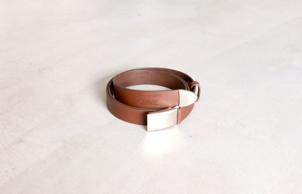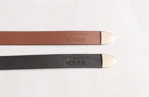 The belt features a silver buckle and tip, and is made from thick leather. The tip of the leather is also embossed with the brand logo, "COMME des GARÇONS HOMME." The subtle yet sophisticated design is complemented by the sturdy leather, which ages beautifully with use. This leather belt is perfect for wearing with loose, wide-waisted pants.