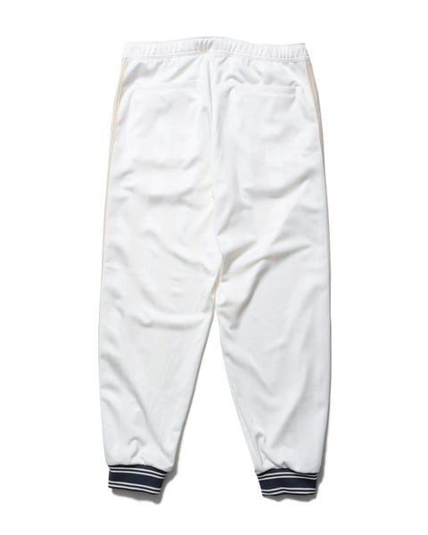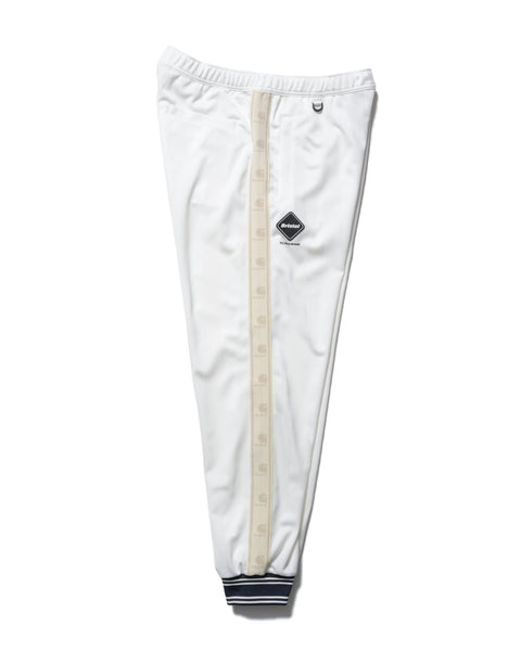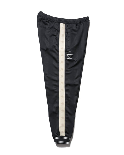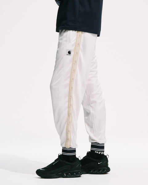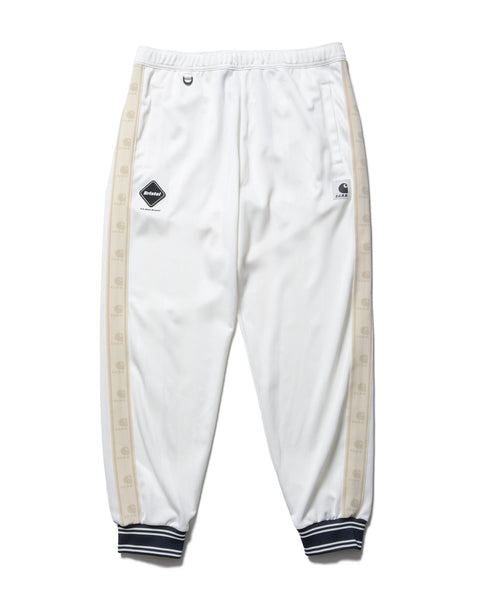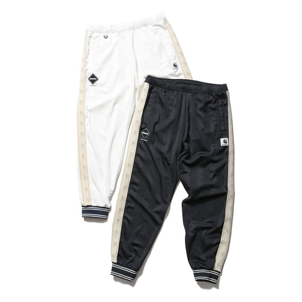 Track pants from the collaboration between F.C.R.B. and Carhartt WIP. The double-jacquard woven polyester jersey is thick yet supple, and the shadow stripes created by two types of yarn shift in appearance with the wearer’s movements. Collaboration emblem tape running along both sides symbolizes the partnership between the two brands. The Bristol emblem is placed on the right thigh, and the collaboration label on the left. The ribbed hem adds a sporty touch to the ankles and pairs perfectly with sneakers. This design pairs exceptionally well not only with the track jacket but with all tops in the collection.
