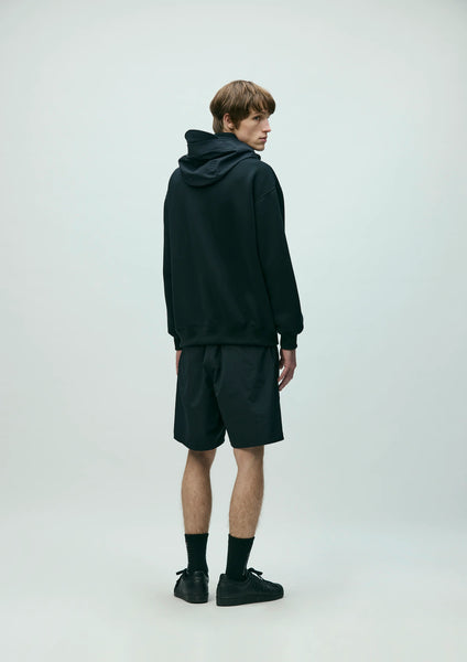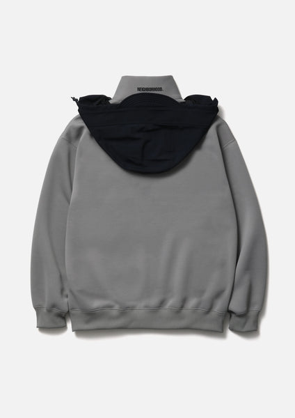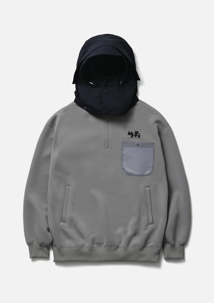 MAP Detachable Hoodie made from a ribbed knit fabric blended with ECO BLUE® recycled polyester yarn. The nylon hood is detachable. Features a kangaroo pocket and a buttoned mesh pocket on the left chest. Logo printed on the top of the pocket and the inside of the collar. Includes a label on the side seam.