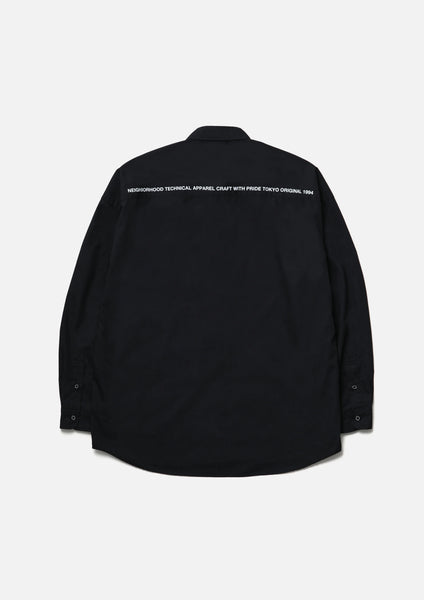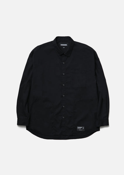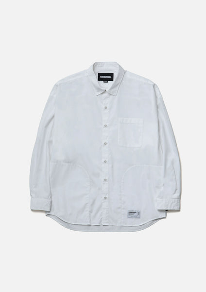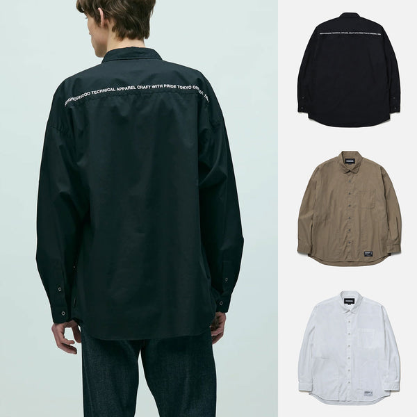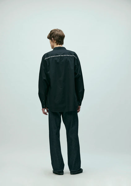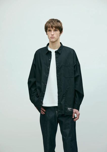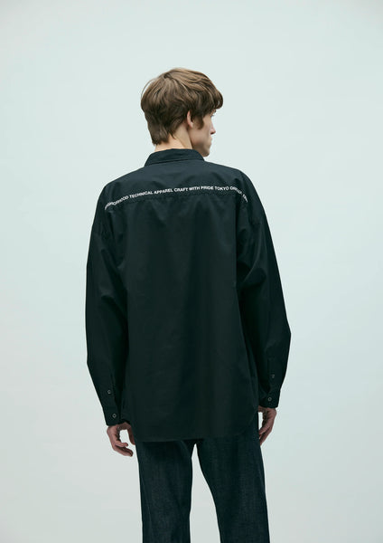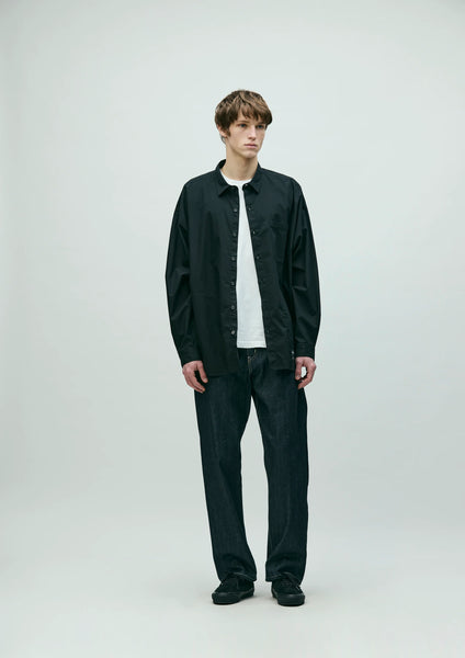 An overshirt crafted from high-quality broadcloth. It features a smooth, durable finish achieved by using combed yarn and optimizing the weave density and thread count to create a lustrous texture. Practical hand pockets are positioned along the side seams. A graphic print adorns the upper back yoke. Original buttons are used. Brand tags are attached to the left hem and the inside of the lower front placket, and a label is sewn into the side seam. The silhouette is relaxed, drawing inspiration from the details of a classic plain shirt. One-wash finish.
