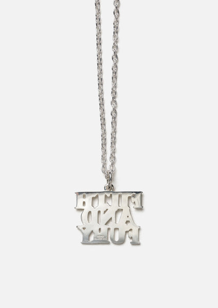 A silver necklace featuring a three-dimensional rendering of an iconic slogan. Crafted from SV925 silver with a 1.9mm round link chain. The logo is engraved on the back. Total length: 50 cm.