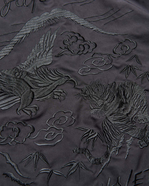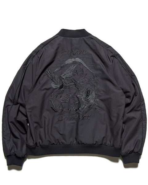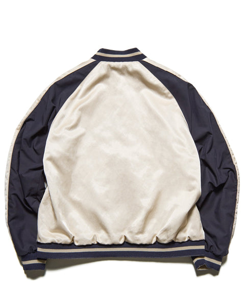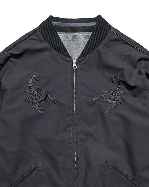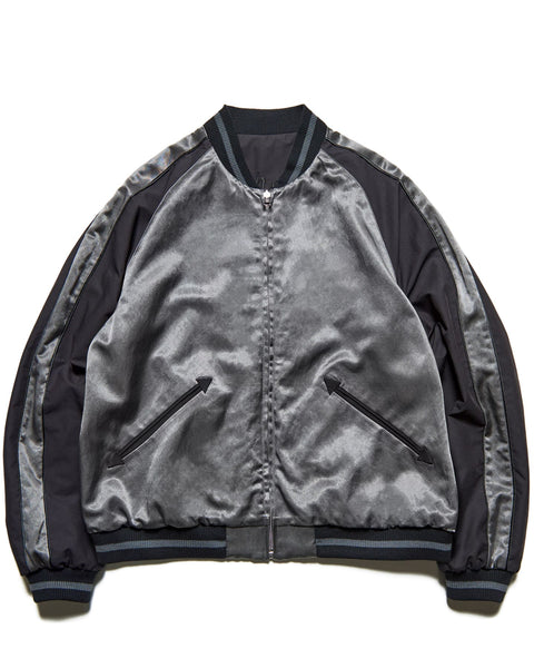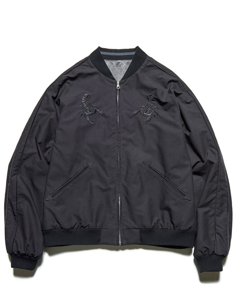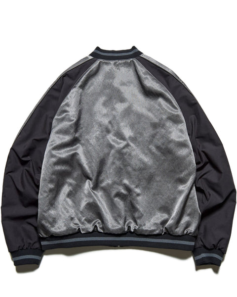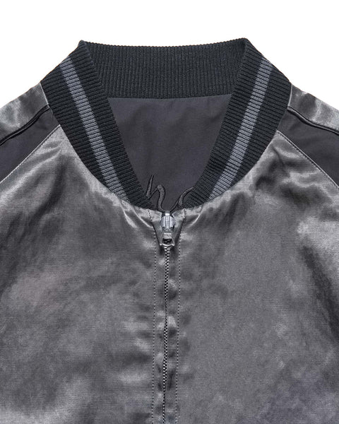 SOPHNET. presents a new generation souvenir jacket with a different look on both sides. The reversible satin fabric, pigment-dyed and bio-bleached, develops a vintage-like texture the more you wear it. The other side is made of a high-density, water-repellent twill, with a subtle contrast between the matte and bright finishes of the body, embroidered with scorpions on both chests and a graphic on the back. This exceptional piece features a relaxed, rounded silhouette and classic details like lined ribs and hem pockets.