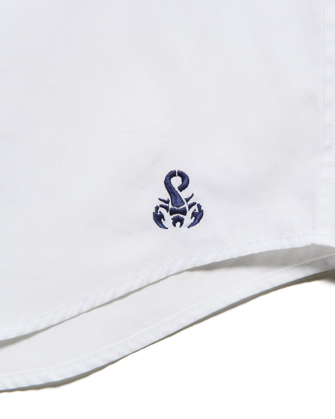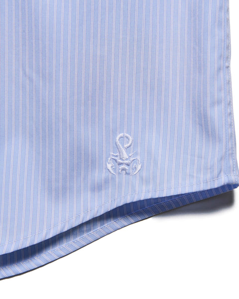 A short-sleeve shirt crafted from premium cotton. By blending rare extra-long staple cotton from Swin and Giza, we’ve created a natural sheen and remarkable smoothness. Available in three colors: a refreshing stripe pattern and two classic solid colors. The cool, breezy impression created by the relaxed fit, combined with the subtle presence of the scorpion embroidery on the left hem, adds a touch of sophistication to your summer wardrobe.