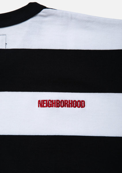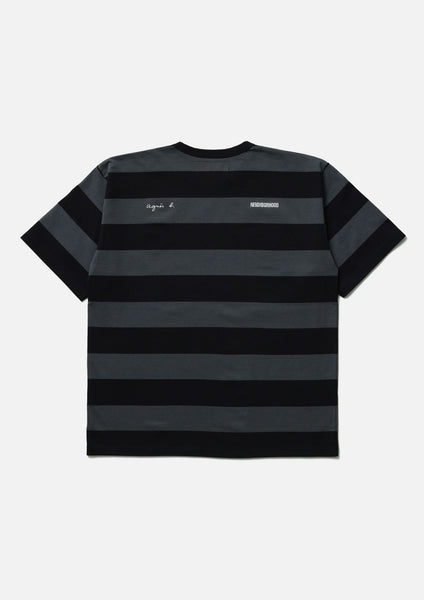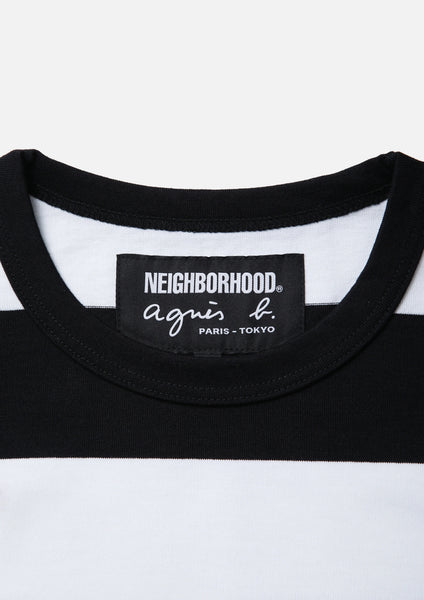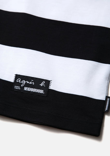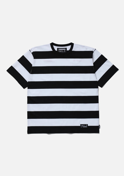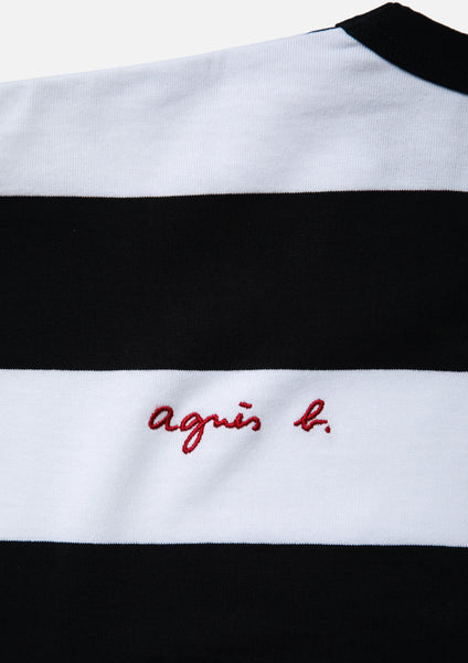 Striped tee in agnès b.’s original wide-stripe jersey. Dual-brand logo embroidery at the back. Brand tags at the left hem and side seam.
