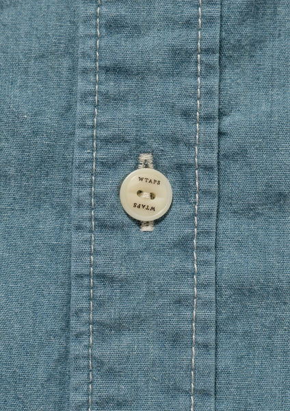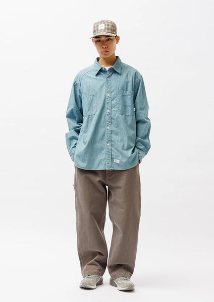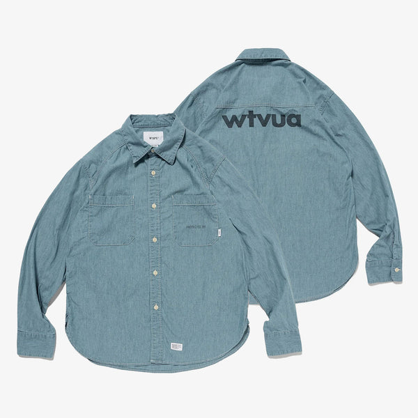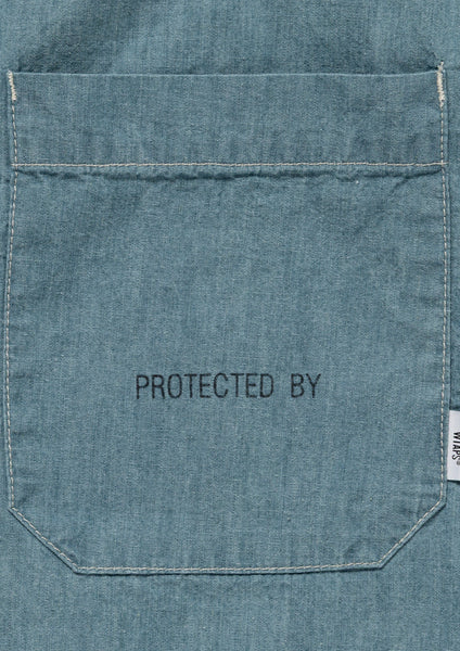 A 5.6-ounce slub chambray shirt with a bio-bleach finish. Featuring a relaxed, rounded cut, this versatile regular-fit style is designed for everyday wear. It features printed motifs on the left chest pocket and the back.