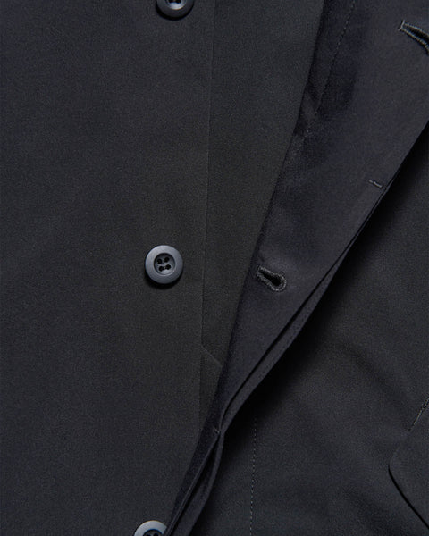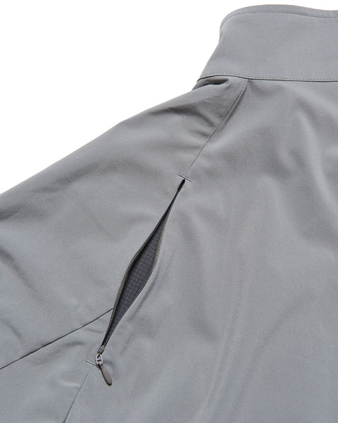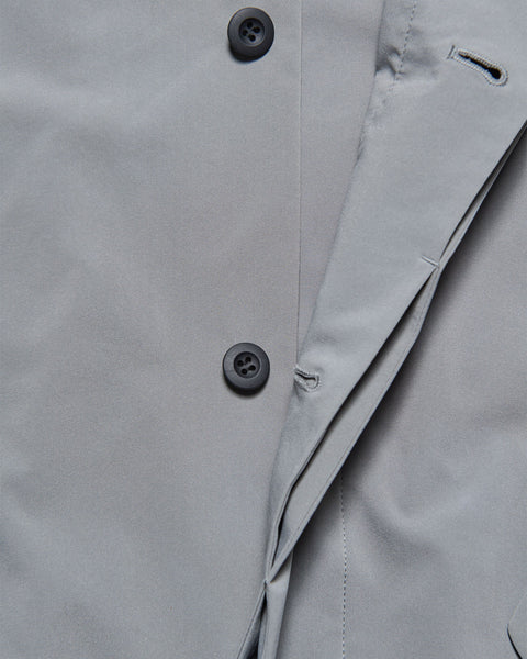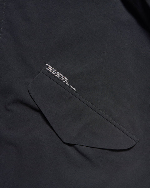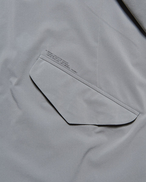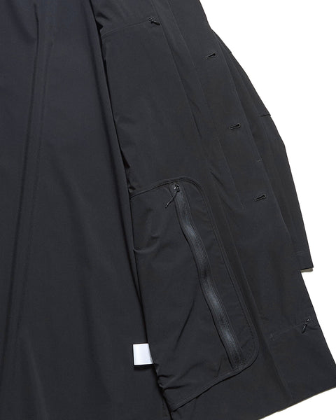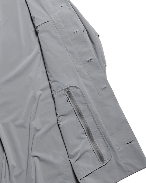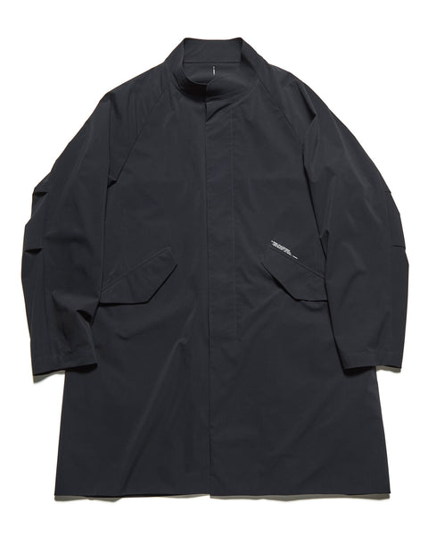 Newly introduced knee-length coat crafted from eco-friendly materials. The combination of plant-derived PP polymer and recycled PET polymer achieves both sustainability and comfort. Its appeal lies in excellent mobility thanks to 4-way stretch and weather-independent practicality from water-repellent treatment. Structural features include rear raglan ventilation panels, zippered pockets on both inner chest sides and the left hem, and the series' standard packable design. The simple stand collar design seamlessly integrates into business settings. Available in two solid colors: Black and Light Gray.