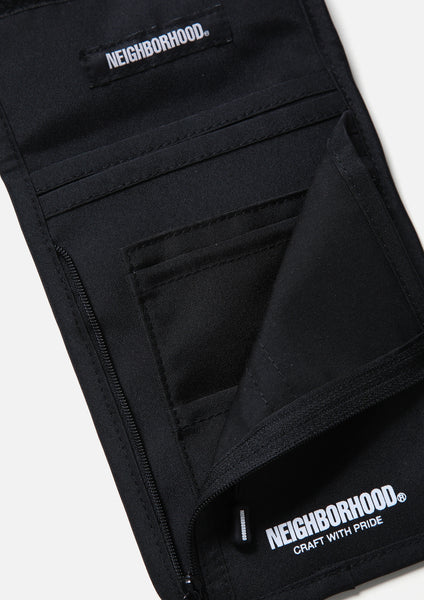 A passport pouch made from polyester oxford fabric. Equipped with multiple card pockets and compartments on the inside and outside for ample storage. Detachable strap. Printed logo on the front. Includes an original rubber zipper pull and a brand name tag.