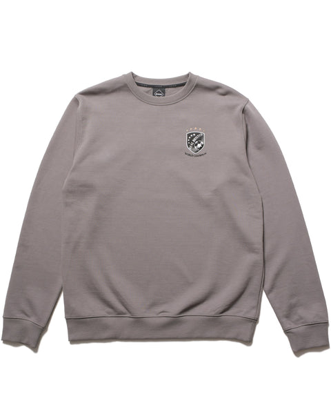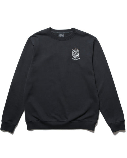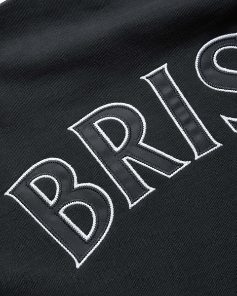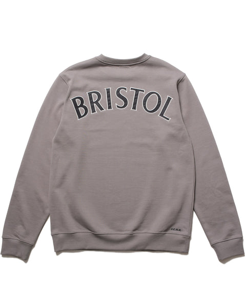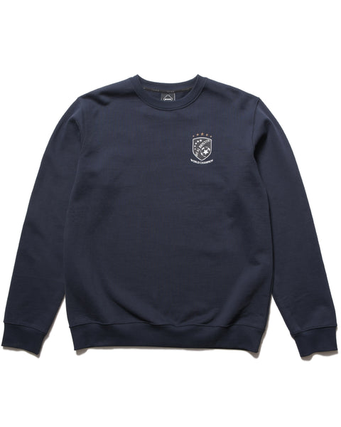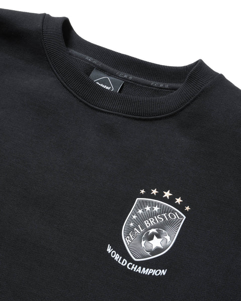 A crewneck sweatshirt featuring a WORLD CHAMPION emblem logo on the front chest and an arched BRISTOL logo patch with a herringbone pattern on the back. The body uses a heavyweight brushed cotton fabric offering moderate warmth and moisture-wicking properties.