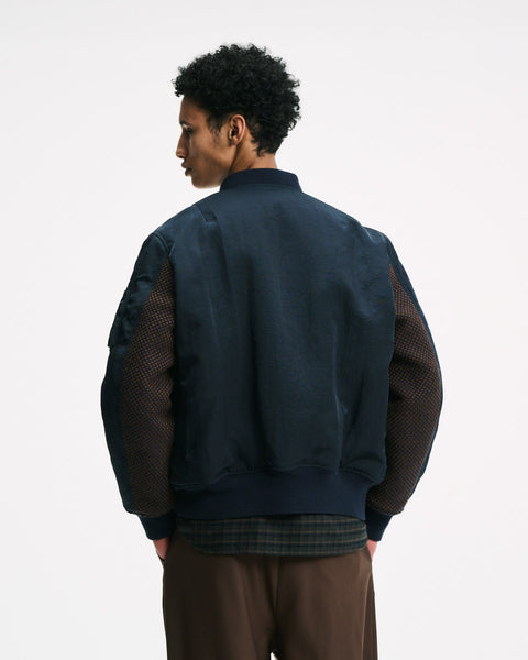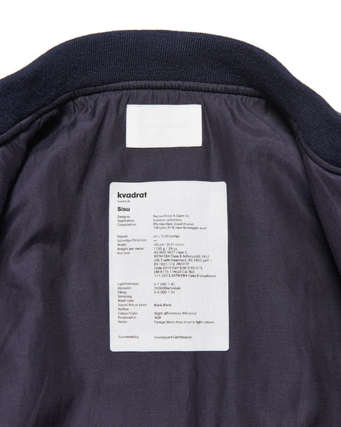 A flight jacket with a signature back sleeve panel in “Sisu.” The fabric's color and paneling create a rhythmic impression. The removable tag on the left sleeve, also in this fabric, is a key detail. The main body is a nylon twill with a distinctive fade effect, evoking a vintage feel. The insulation uses Climashield®, also adopted in modern military applications. It offers warmth equivalent to down while being lightweight, maintaining functionality in humid conditions and with repeated wear. Its compact volume makes it a versatile outer layer that pairs well with any inner layer.