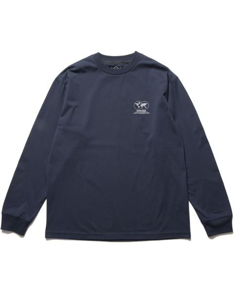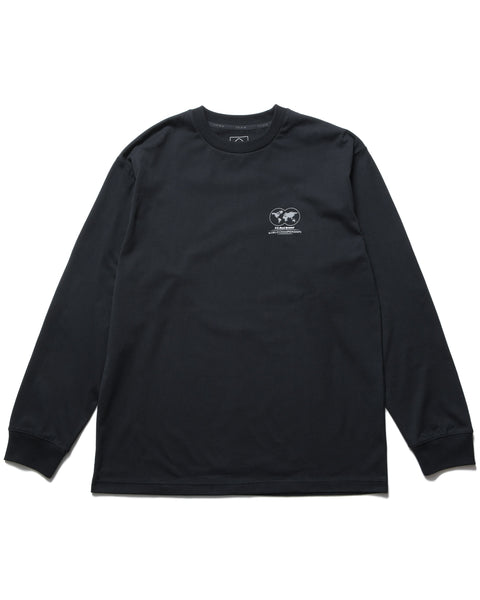 This season's new release features a cotton jersey long-sleeve T-shirt known for its high strength and smooth feel, printed with the fictional WORLD CHAMPIONSHIP logo also used on our sweatshirts. The world map section on the back incorporates reflective material, adding a subtle design accent.