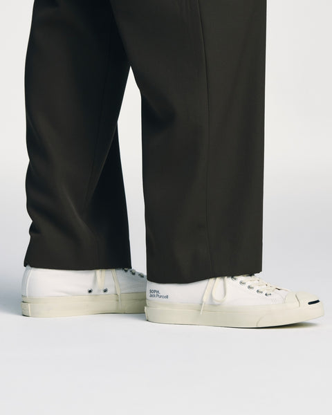 A collaboration model with Converse's timeless classic, the Jack Purcell. The logo is set in silver, matching the eyelets, on the inner heel counter and tongue. While the lettering is straightforward, its subtle placement provides a witty accent. The pure white body colour and organic colour scheme achieve both universal versatility and sophistication. SOPH. presents a new interpretation of this universal model.