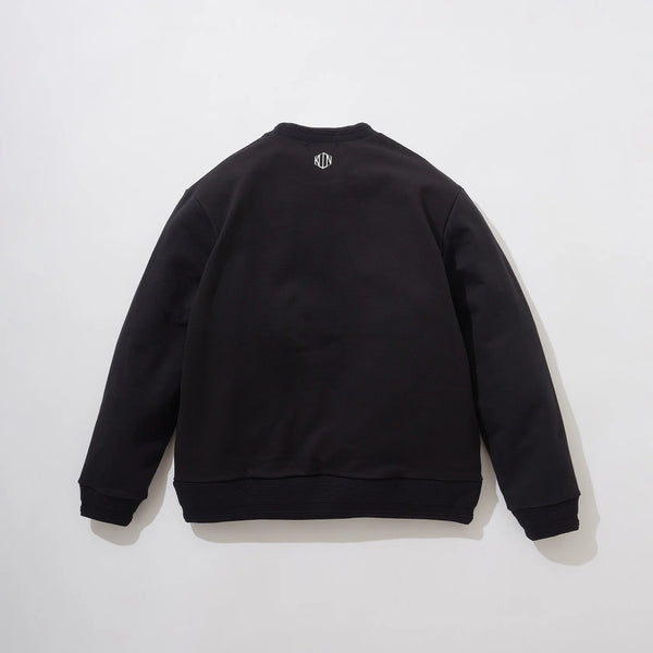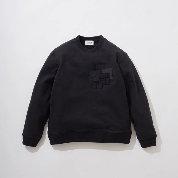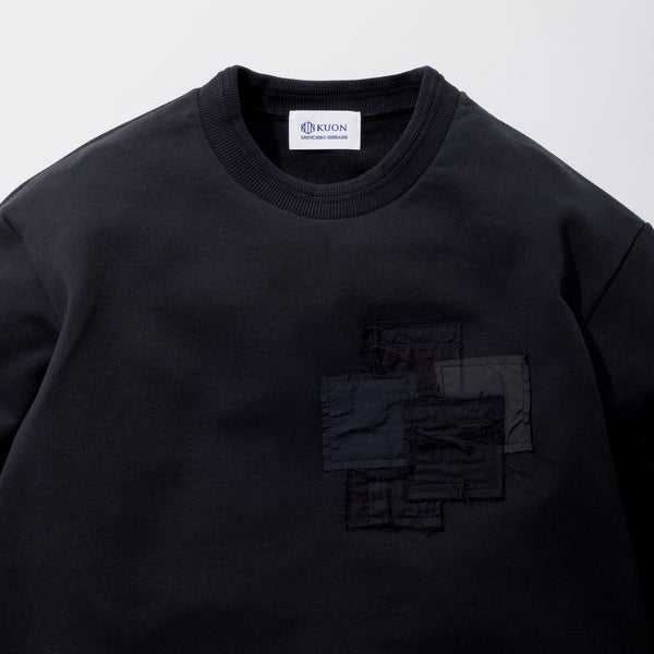A sweatshirt featuring the Upcycle Boro Type 2 a contemporary take on traditional patchwork—and remnants from the collection. The relaxed shoulder width and body width are balanced by a cropped length and narrower sleeves, creating a defined silhouette. It takes centre stage as a single layer in early autumn, and the slim sleeves prevent bulkiness when layered under outerwear in winter. The collar, cuffs, and hem feature original knitted ribbing, creating a boxy silhouette that falls straight.