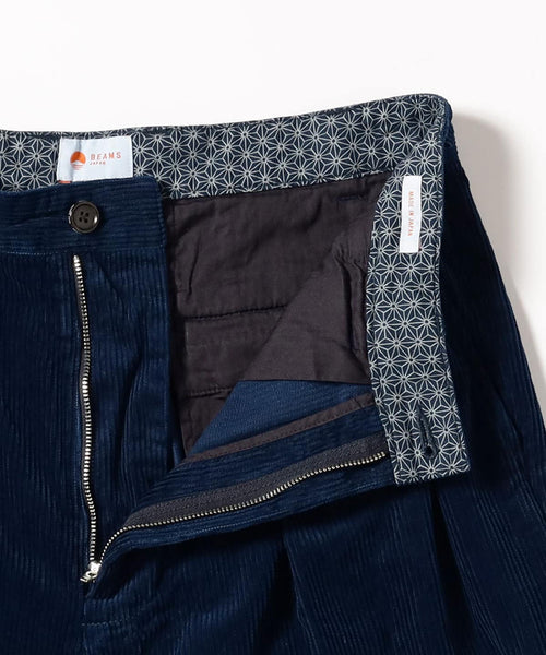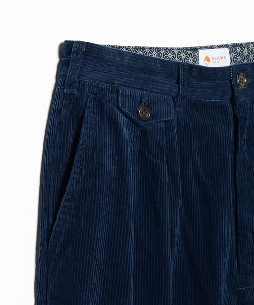 Indigo-dyed corduroy fabric undergoes ball bio processing to achieve a natural drape and worn-in feel reminiscent of denim. It develops character with each wear.