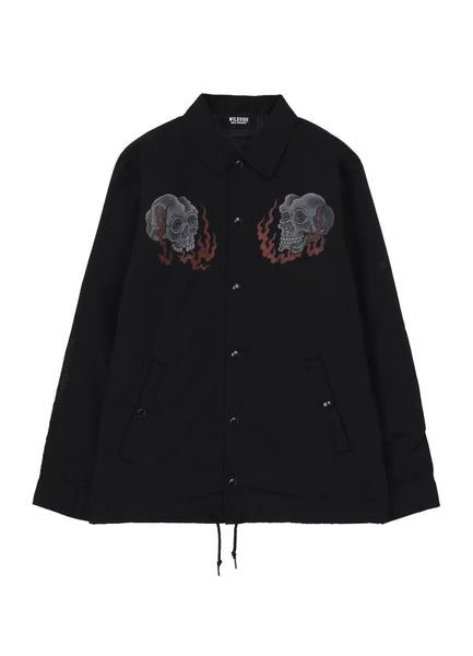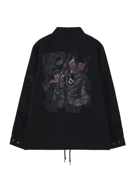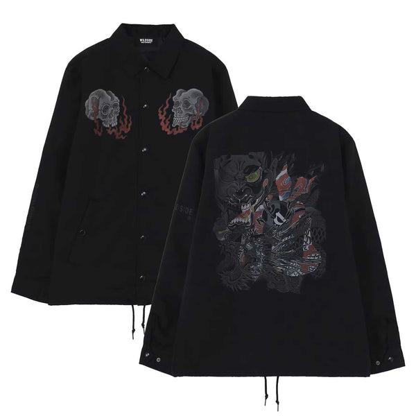 A coach jacket featuring skull motifs inspired by Daisaku Hisase’s tattoos on both chest panels.