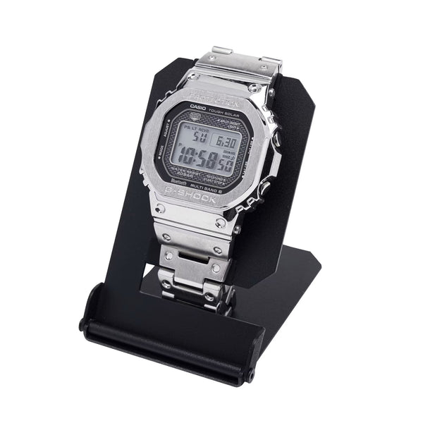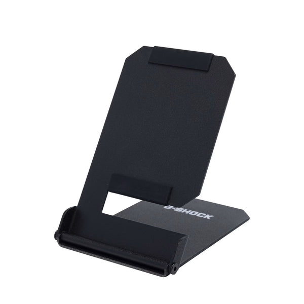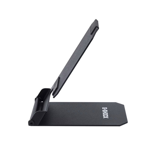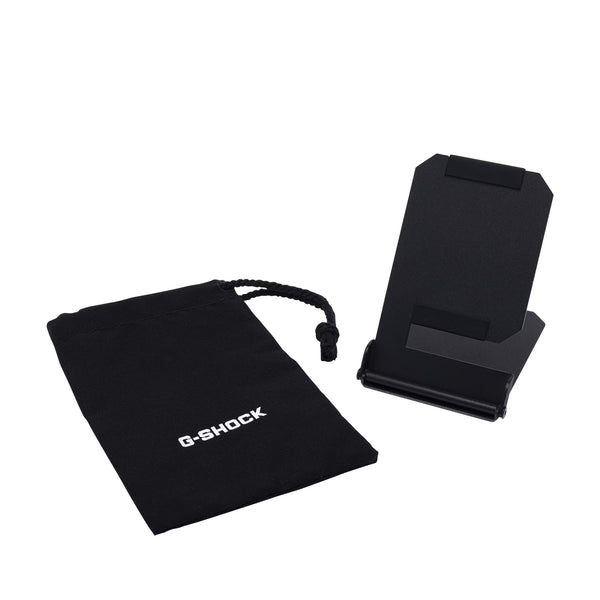 This portable watch stand folds compactly for easy carrying. It's perfect for placing your watch on your desk during work, by your pillow at hotels during stays, or as a convenient spot to set your watch when removing it while out and about. Watches can be easily placed and removed, with silicone material gently protecting contact points. Its matte pearl finish in black expresses the distinctive G-SHOCK aesthetic. Includes a dedicated pouch, making it a reliable item for smartly storing your watch at hotels during business trips or vacations. It comfortably supports your G-SHOCK life, from everyday use to special occasions.