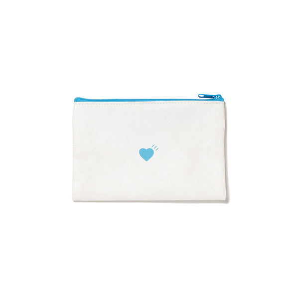 The pouch, designed to carry the instant coffee sachets, features a simple white base with an eye-catching blue zip. Key details include the bottle logo printed on both sides and the HUMAN MADE heart logo.