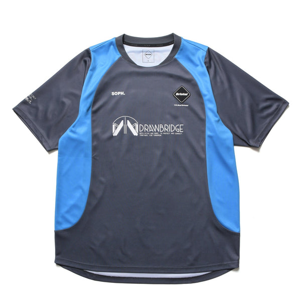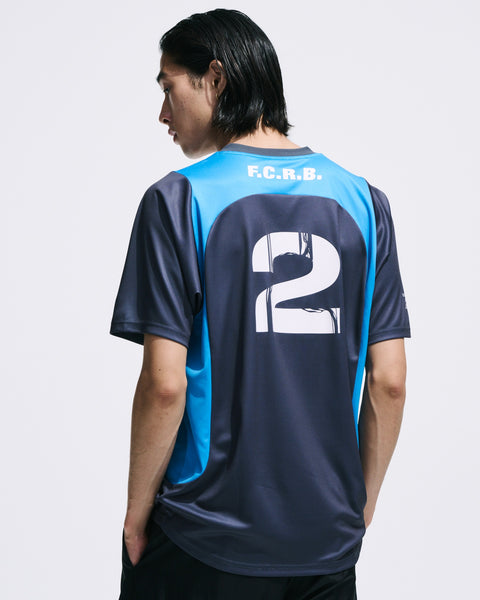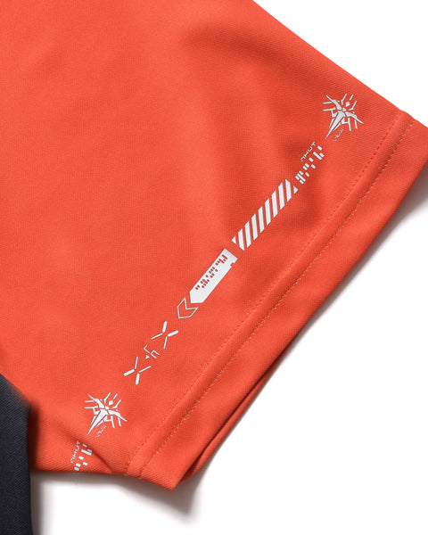 A football shirt projecting the game's world onto the pitch. The number “2” represents DS2, featuring two distinct designs embodying the two organizations within the game. “DRAWBRIDGE” features a gray base with blue streamlined panels, while “GHOST MECH” uses vermilion as its base, expressing the emergence from tar through a gradient. This product is designed to heighten excitement not only on the football pitch but also while playing the game itself. The body utilizes eco-friendly material made from recycled plastic, raising awareness for a sustainable future.